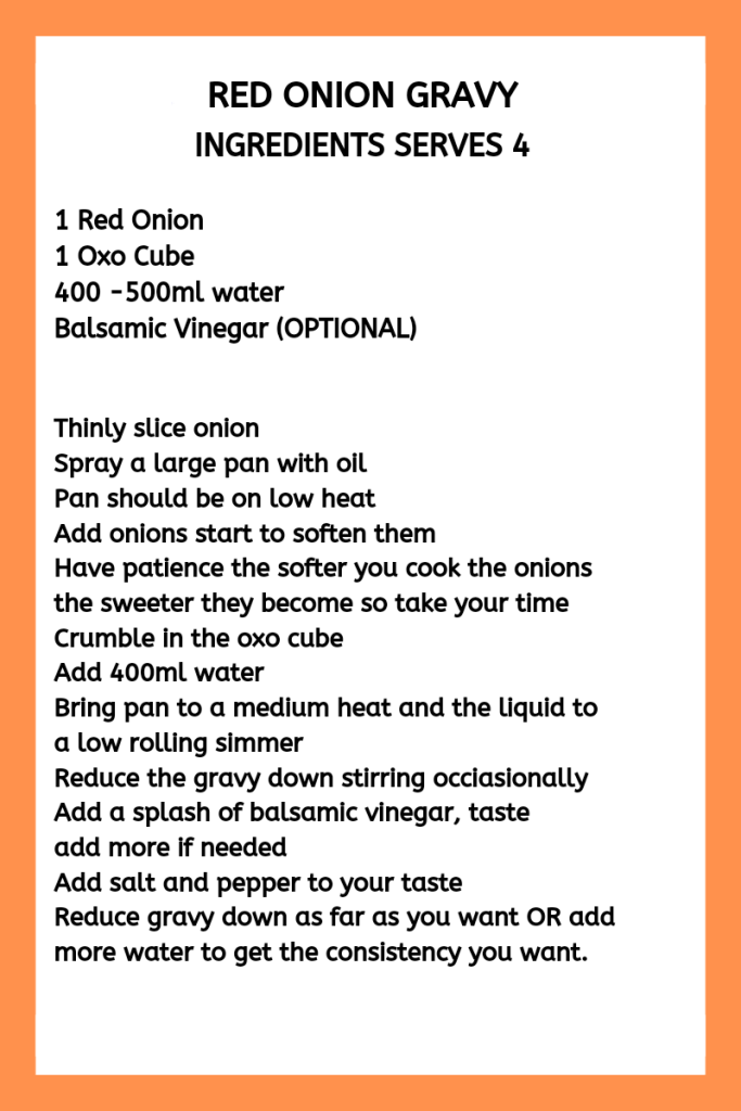 If you don’t have a red onion then use a white one, you can leave it chunky as i did or blend it smooth – onion is a natural thickener so it will really help get a fab thickness if like me you like your gravy to coat the food.