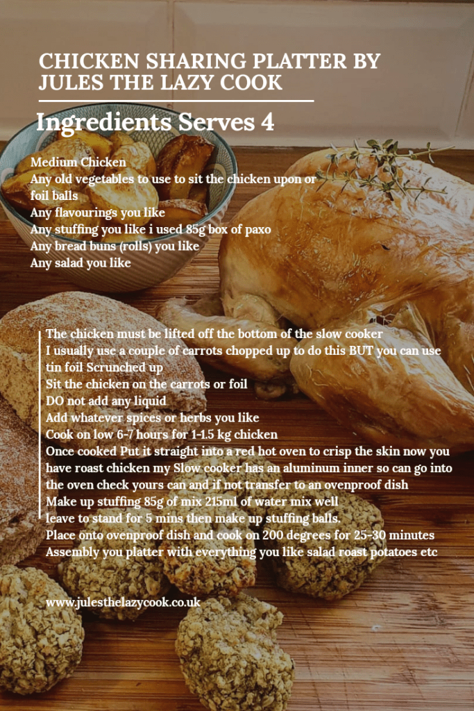 This is basically my Slow cooker chicken to roast chicken served with bread buns stuffing amd roast potatoes… so a kind of deconstructed Sunday Dinner. Serve woth anything you and your family like it all works with these kind of meals.