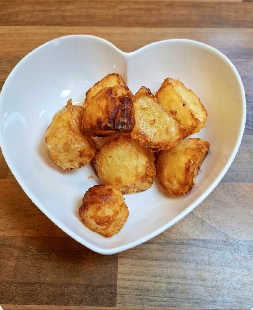 Have patience and make sure you let them steam dry this will help with the crispy outer you are looking for. Did you know goose fat is approx 90 calories per tablespoon and that tablespoon coated all the potatoes in the video twice! Brushing the goose fat on is the key to keeping the calories down because you aren’t blindly pouring goose fat over your potatoes, so yes you can have your roasties and enjoy them.