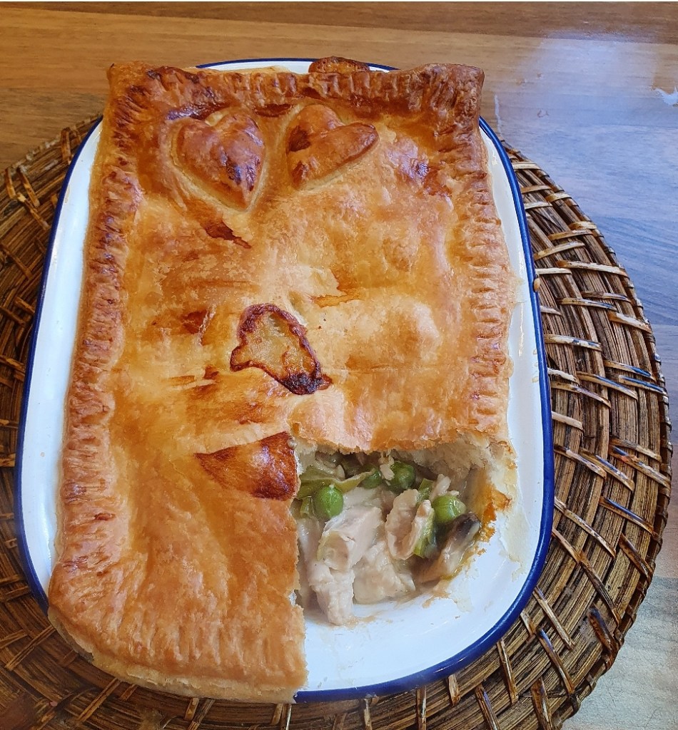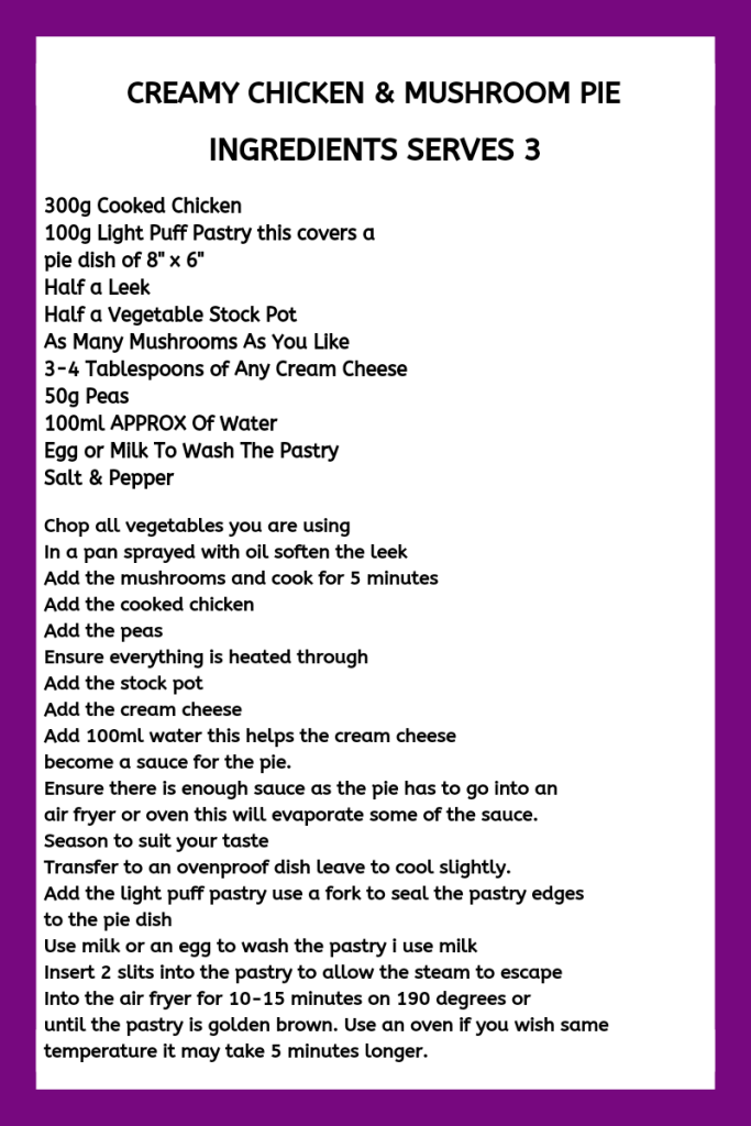 In this version I followed the recipe from above then topped it with light puff pastry the dish I use holds 3 portionsand takes approx 100g of pastry