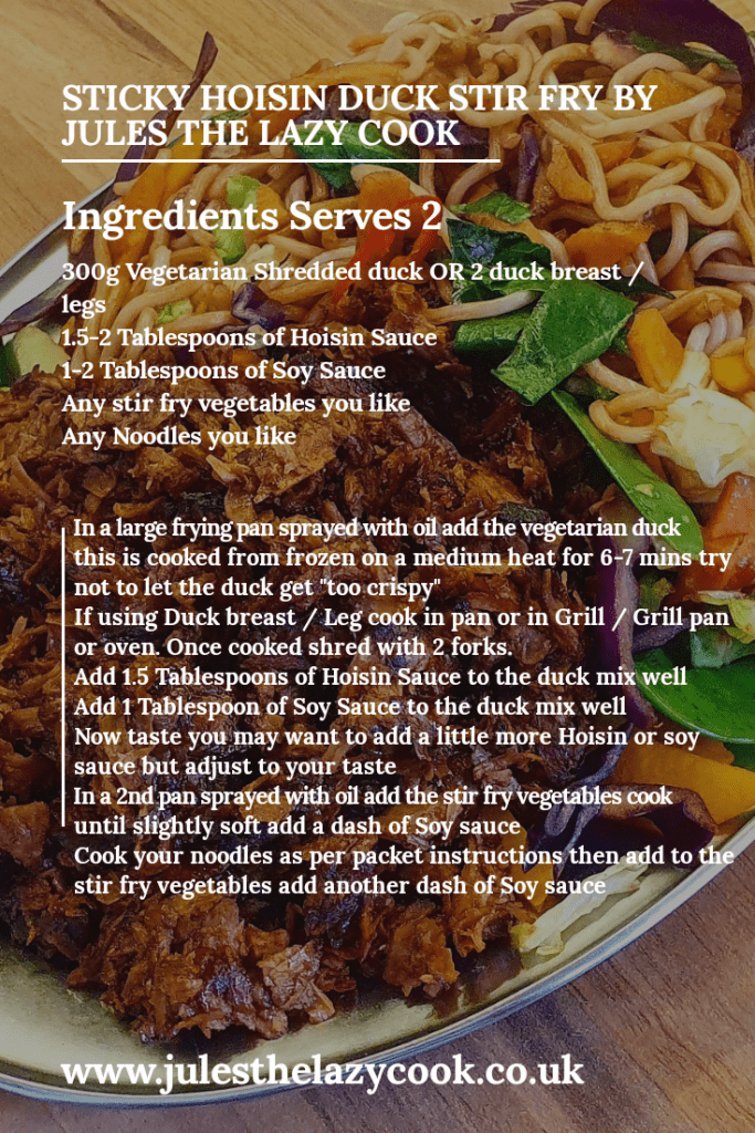 I decided to make a stir fry out of mine but you could use this as a basis for a Chinese Fakeaway, from frozed the duck i used takes 7 mins to cook perfect for a mid week meal too.