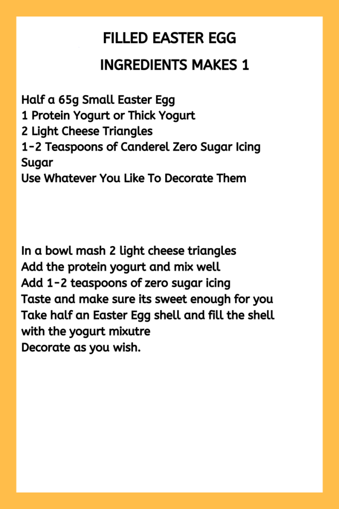 Syns = Half the shell 10 syns, Protein Yogurt half a syn, Icing Sugar syn free, cheese triangles HEa. Total 10.5 syns per egg. Add whatever you are going to decorate it with .