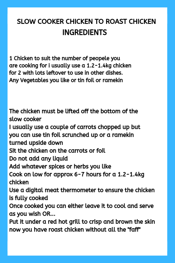 Or you can turn it into a roast chicken, once cooked pop it straight into a red hot oven to crisp the skin my slow cooker has an aluminium pot so i can pop mine under a grill or in the oven. BUT make sure yours can go under the grill or into a hot oven most enamel pots can’t so check the manufacturers instructions. The best way around this if you are unsure is to place the slow cooker chicken into an oven proof casserole dish then place it into the oven.